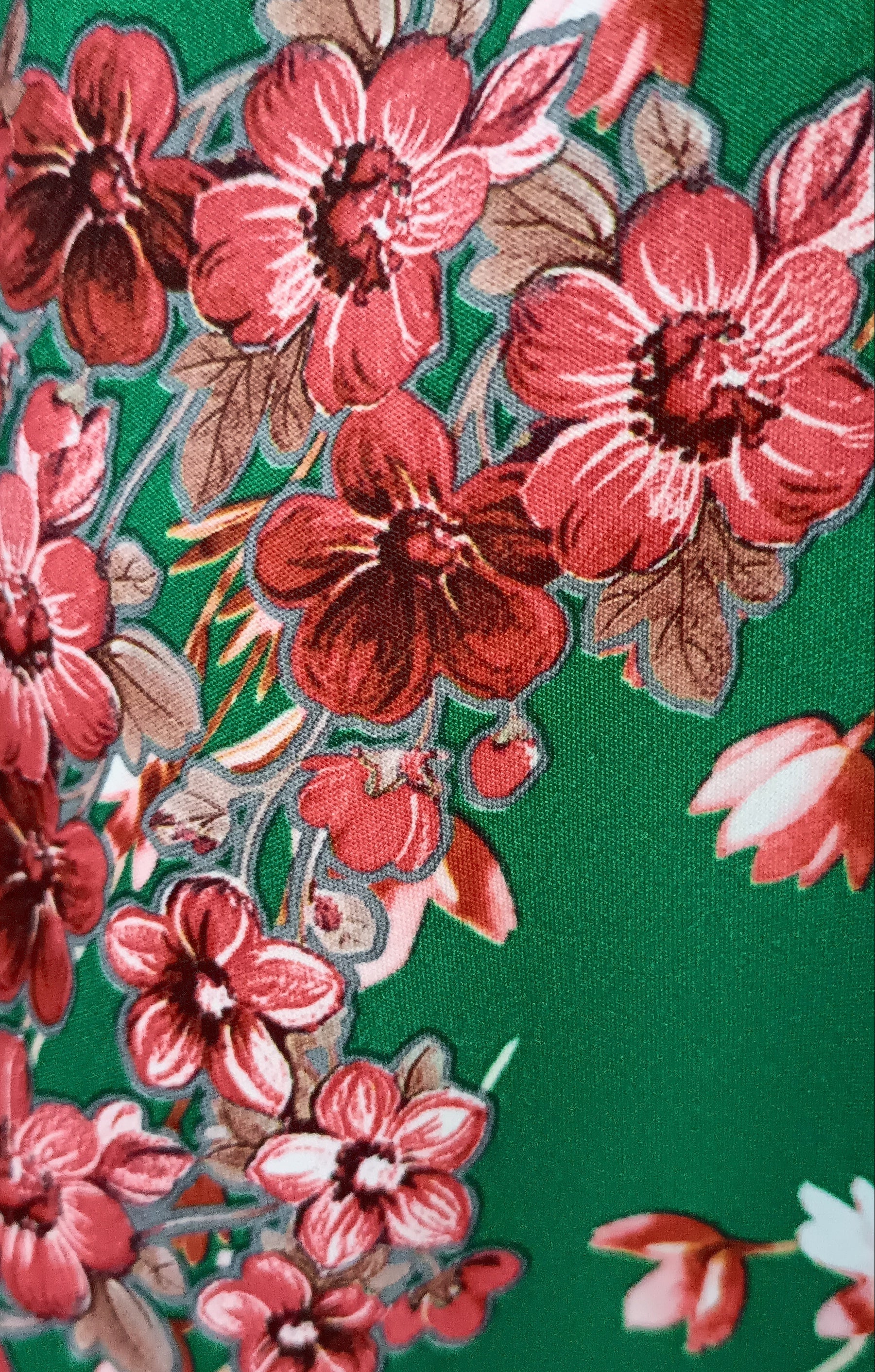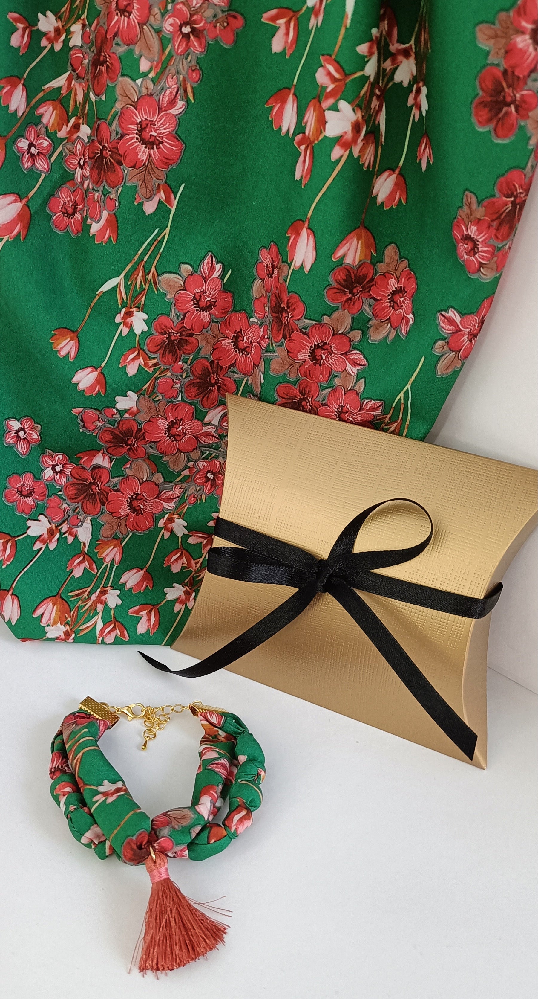 Le premier rang, en tissu plat vert intense orné de fleurs rouges et blanches, met en valeur un pompon en satin délicatement placé au centre, une touche raffinée et joyeuse.