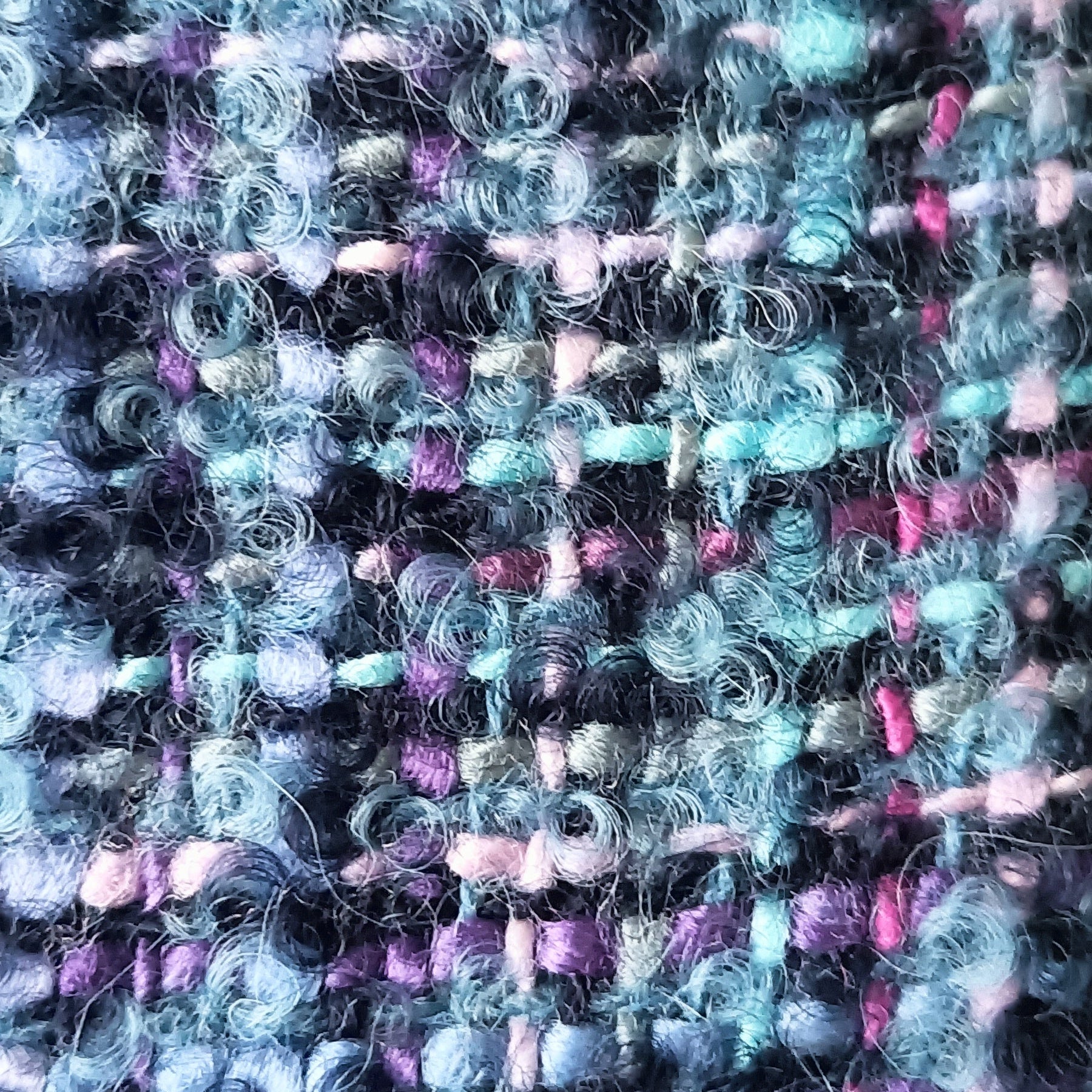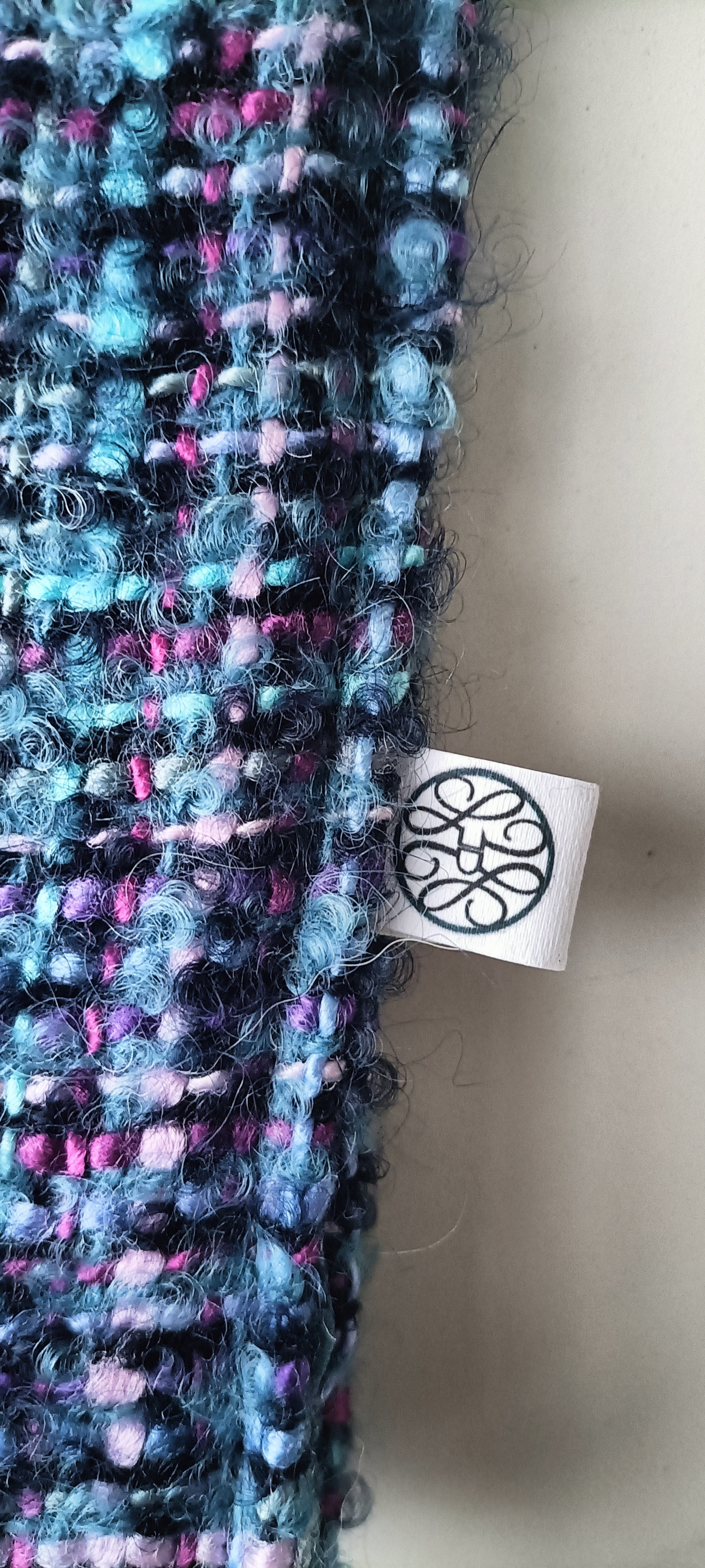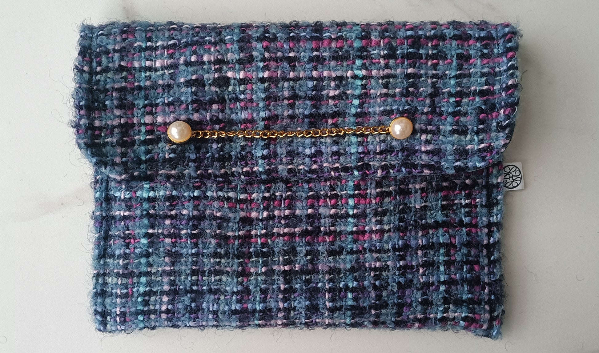 Cette pochette de soirée révèle un dialogue subtil entre textures et couleurs. Son tweed précieux mêle plusieurs nuances de bleu, réveillées par une touche de rose fuchsia, comme un éclat inattendu au cœur de la nuit.