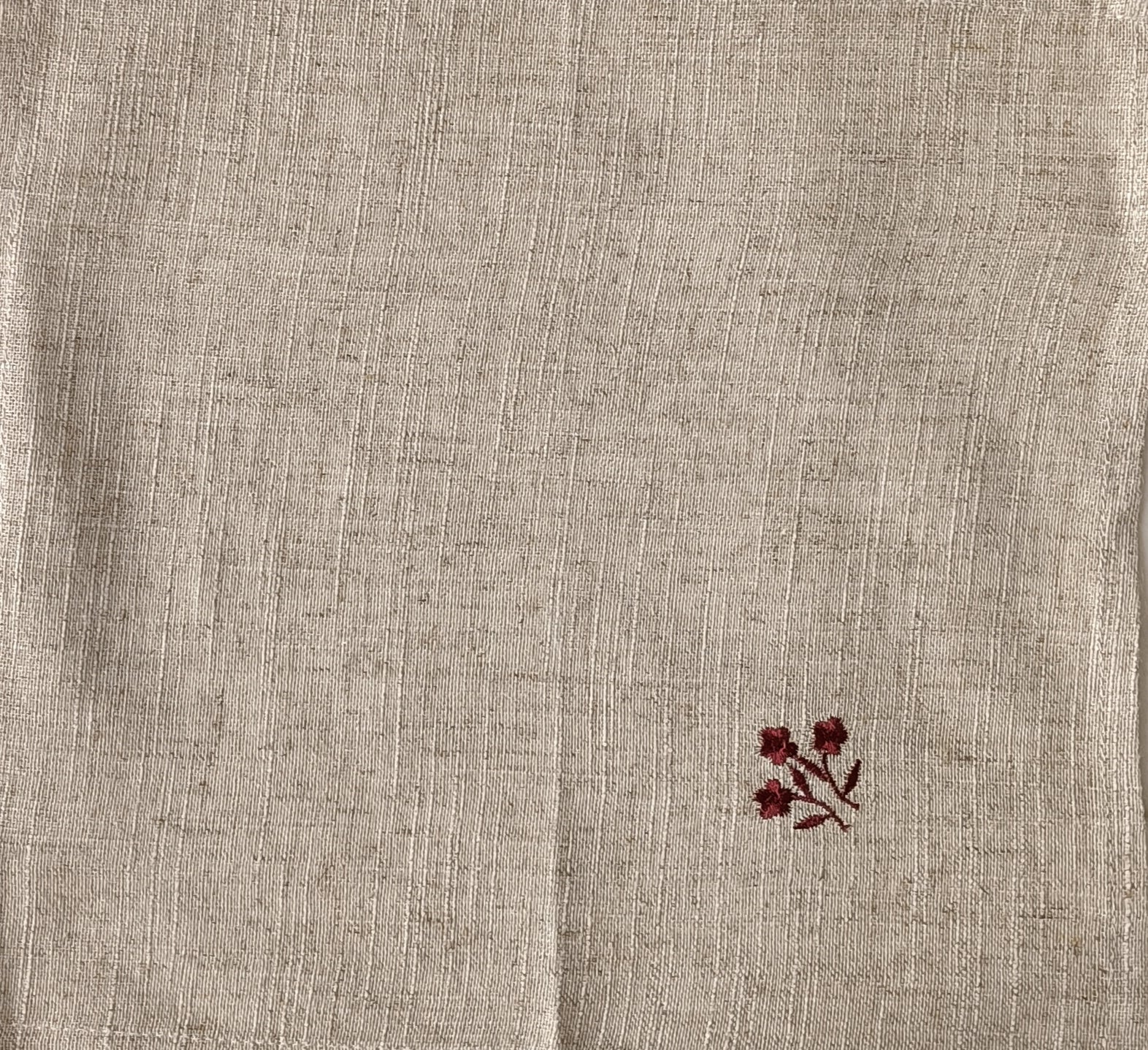 Ensemble de 4 serviettes de table en lin naturel, imaginées pour sublimer vos tables avec une touche d’authenticité raffinée. Chaque serviette est soigneusement brodée de fleurs d'un rouge Burgundy très tendance.