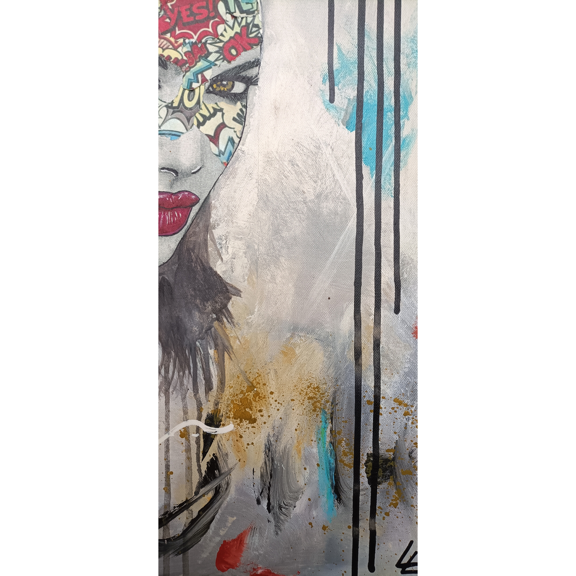 Plongez dans le regard envoûtant de cette héroïne et dans l’univers vibrant de l’art moderne avec cette création unique, réalisée en techniques mixtes sur châssis bois.