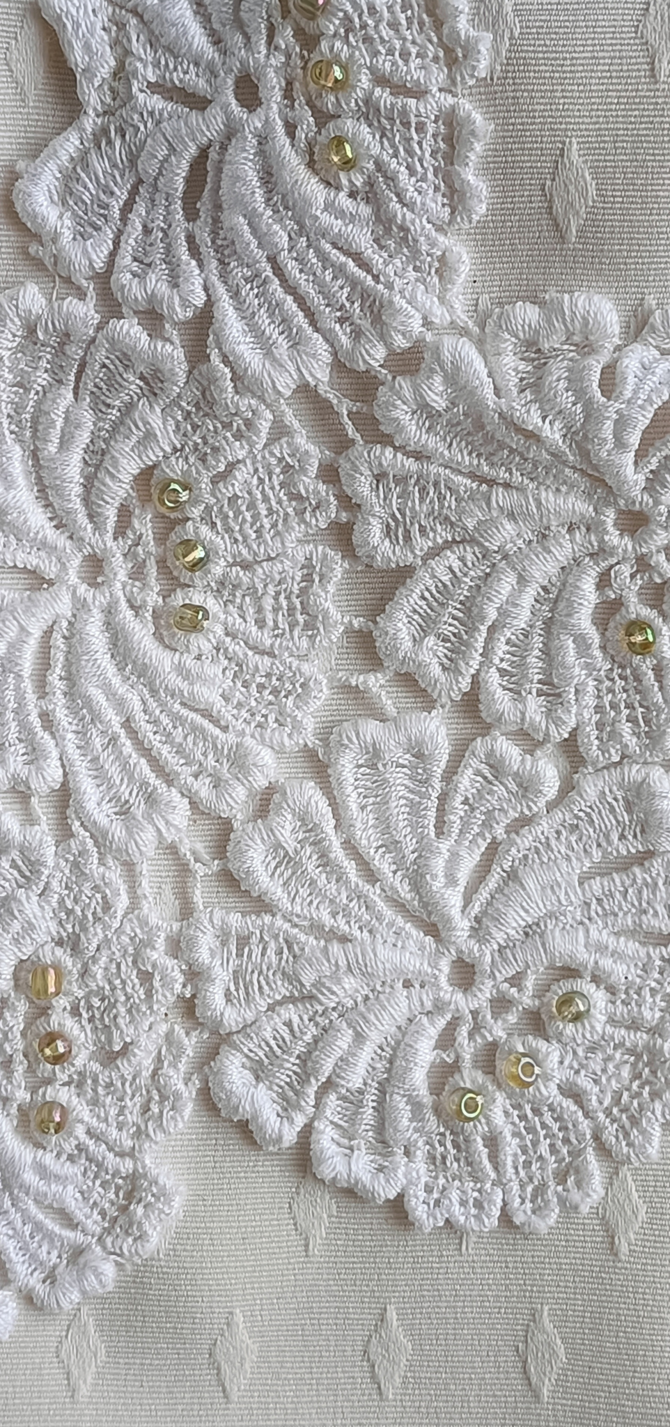 - Matières principales extérieures : tissus recyclés (coton piqué/ broderie de dentelle/ dentelle avec franges/ perles de verre)