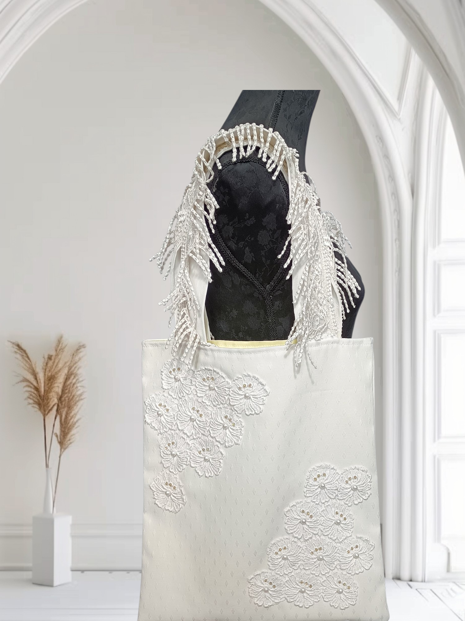 Les tissus s’entrelacent comme autant de souvenirs, tandis que des perles scintillent délicatement sur les broderies de dentelle. Les anses, recouvertes de dentelle et ornées de franges, apportent une touche de sensualité et de féminité à votre épaule.